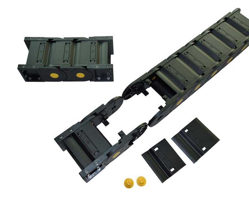 塑料拖鏈由兩個側(cè)鏈連接在一起,頂部和底部通過橋接件連接在一起。
