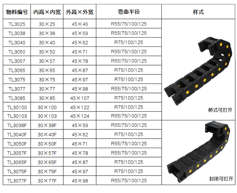 TL型塑料拖鏈規(guī)格是以內(nèi)高x內(nèi)寬定義的,單位為mm