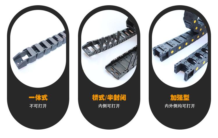 TL塑料拖鏈分為一體式(不可打開(kāi))、橋式/半封閉(內(nèi)側(cè)可打開(kāi))和加強(qiáng)型(內(nèi)外側(cè)均可打開(kāi))三種。